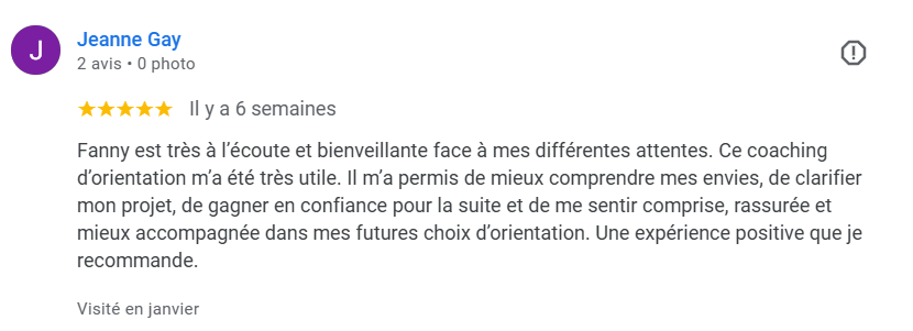 Le coaching te permet d’aller en profondeur dans la découverte de tes valeurs, besoins, talents, il est donc essentiel de t’investir pleinement dans la démarche car c’est toi qui avances vers ton projet professionnel.